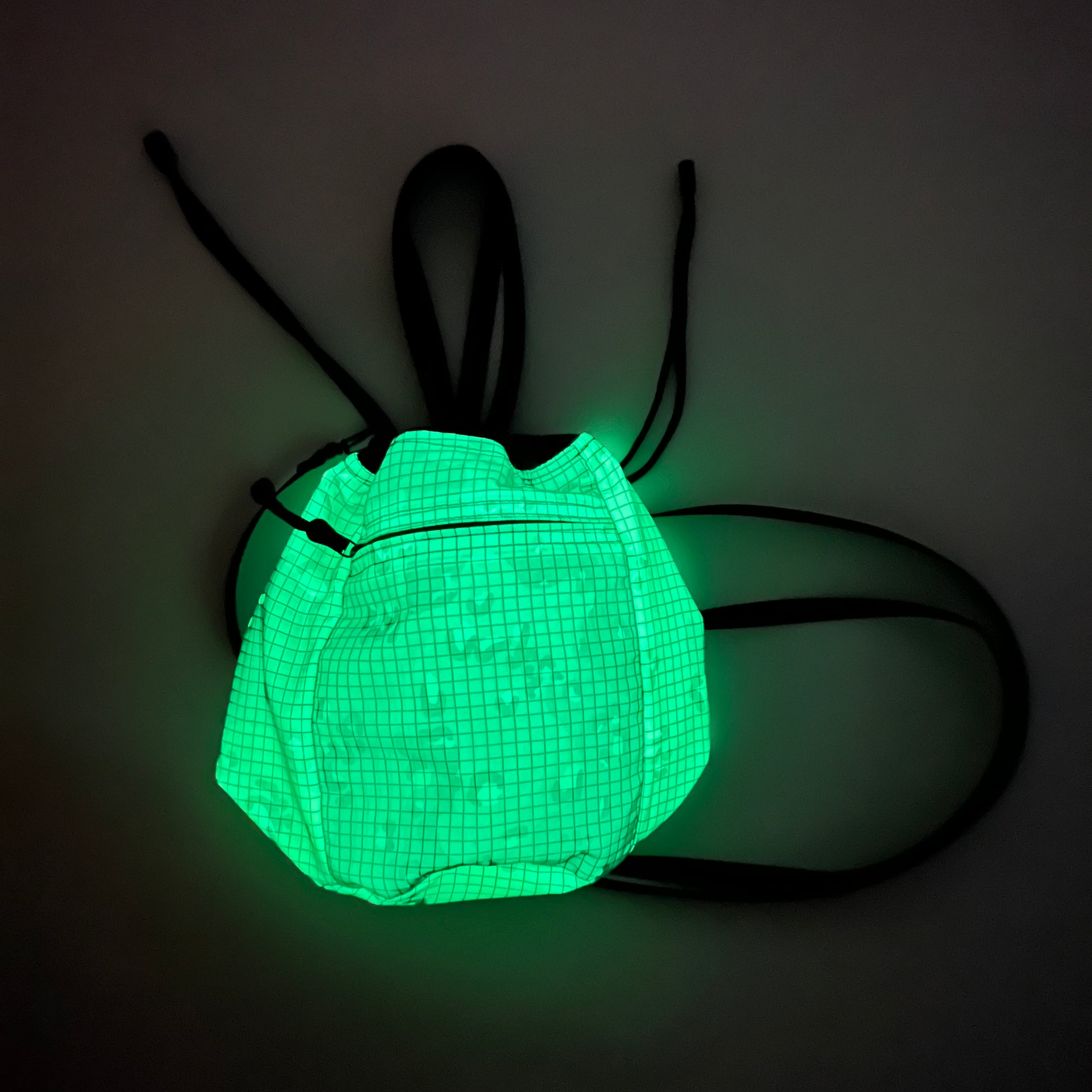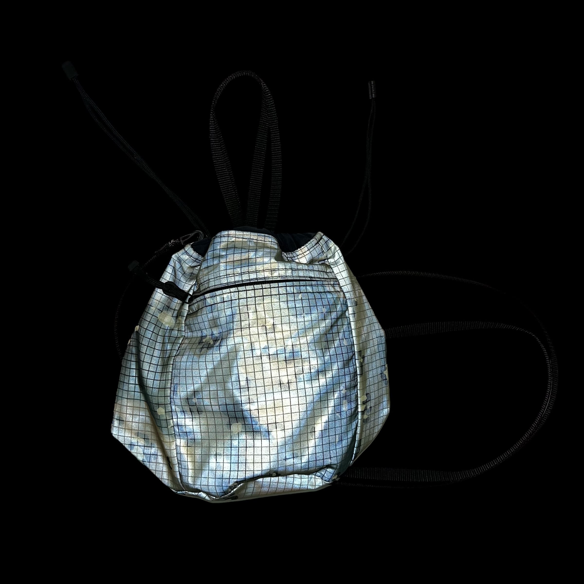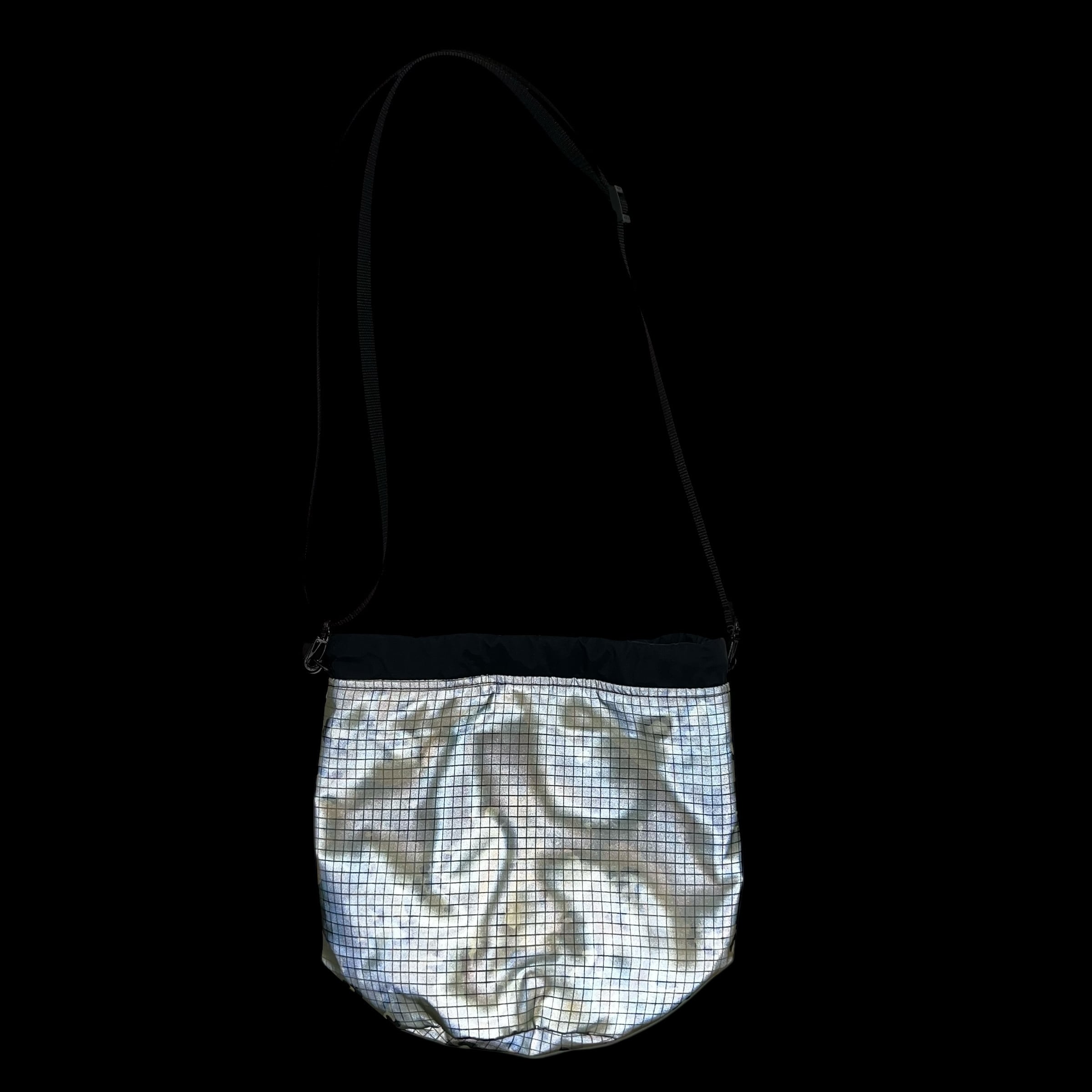 蓄光リフレクター生地とWiniche&Co.オリジナル迷彩柄メッシュナイロンを組み合わせた巾着ポーチ。
