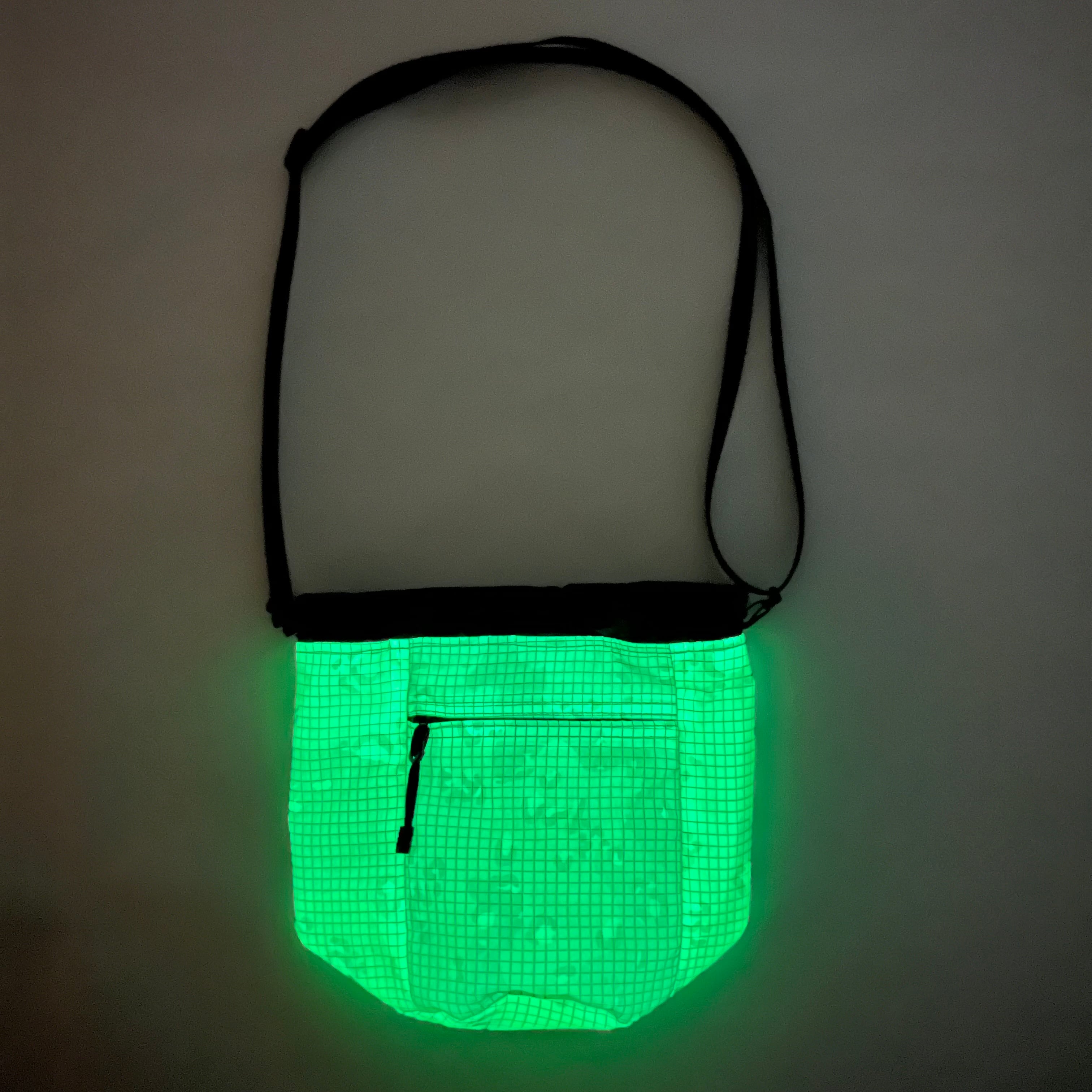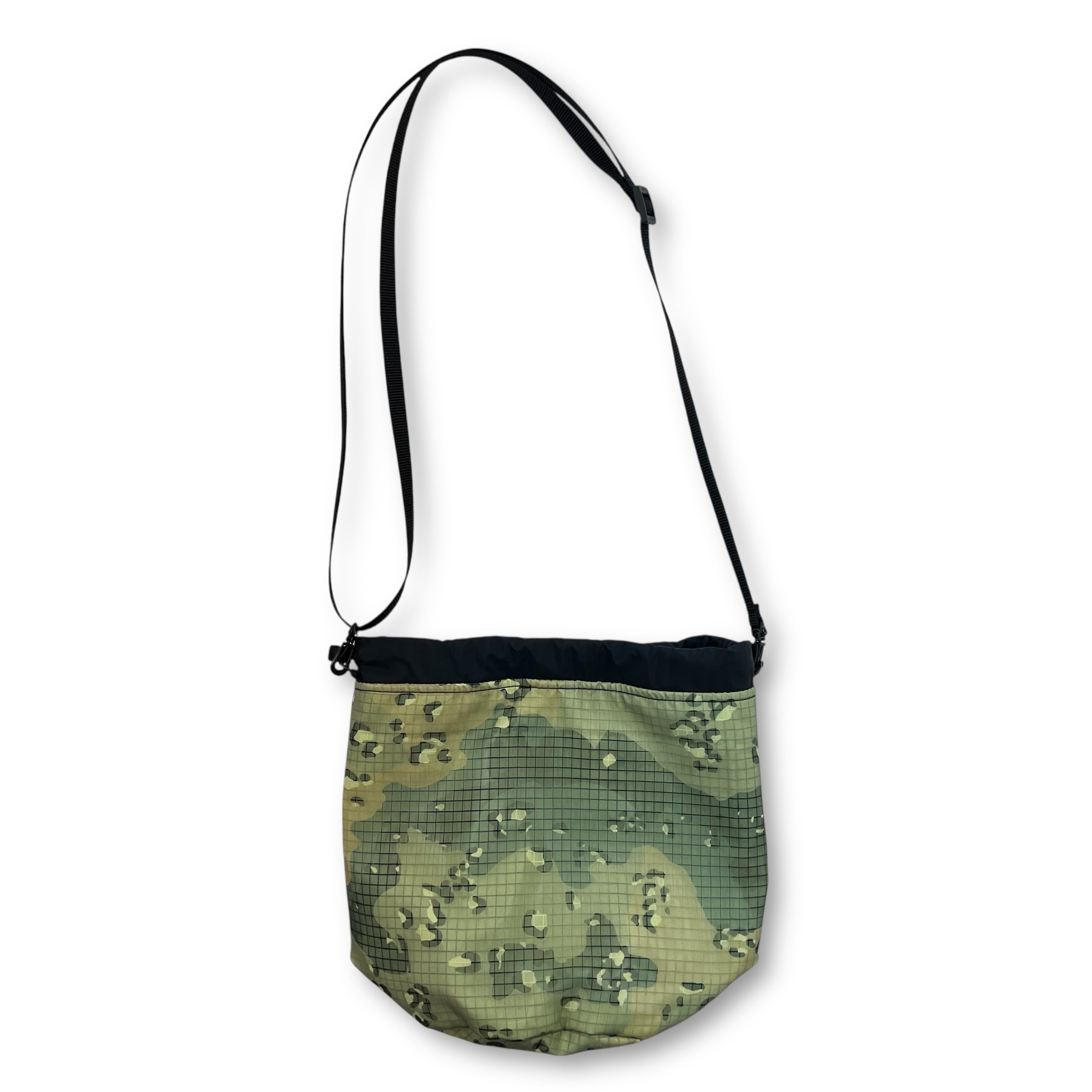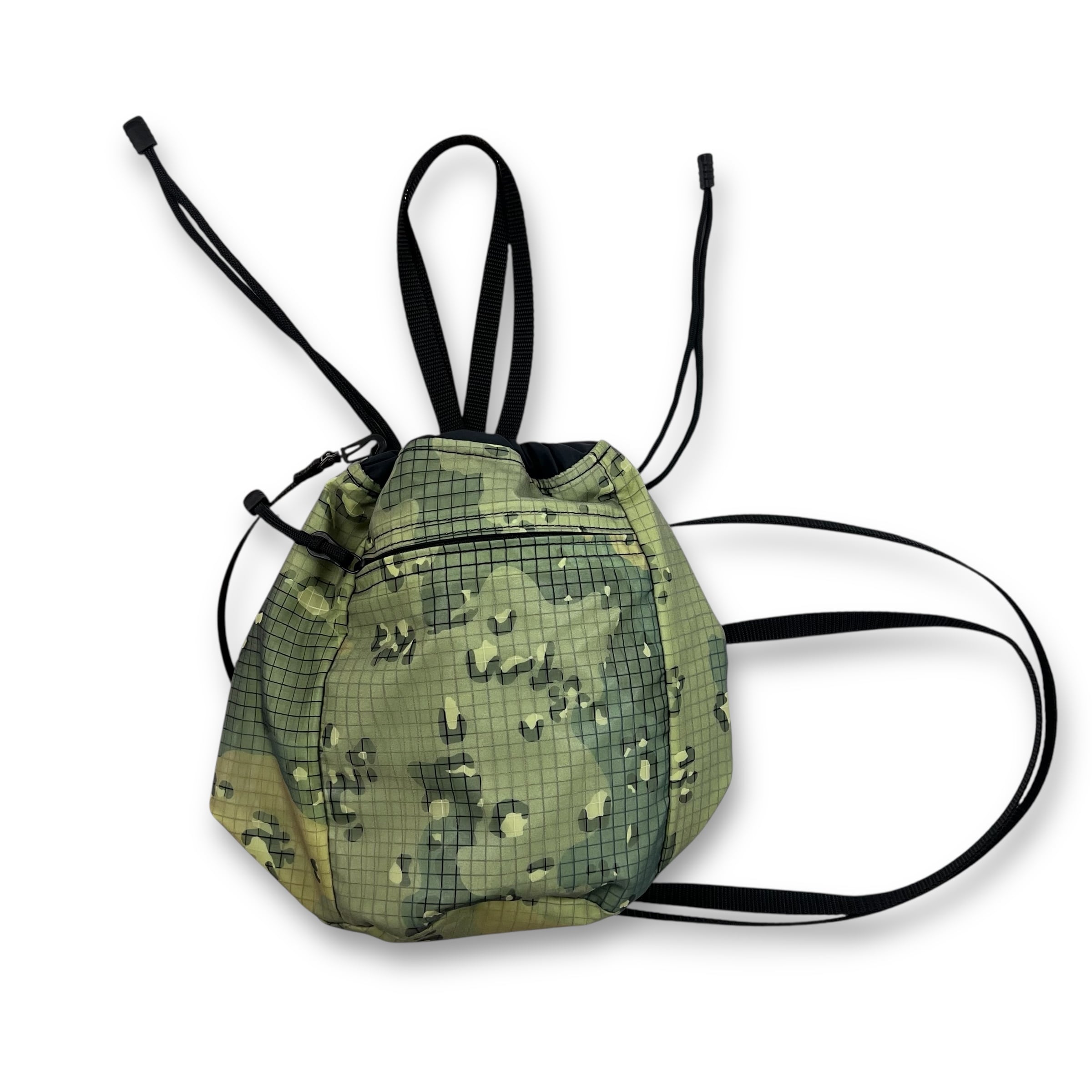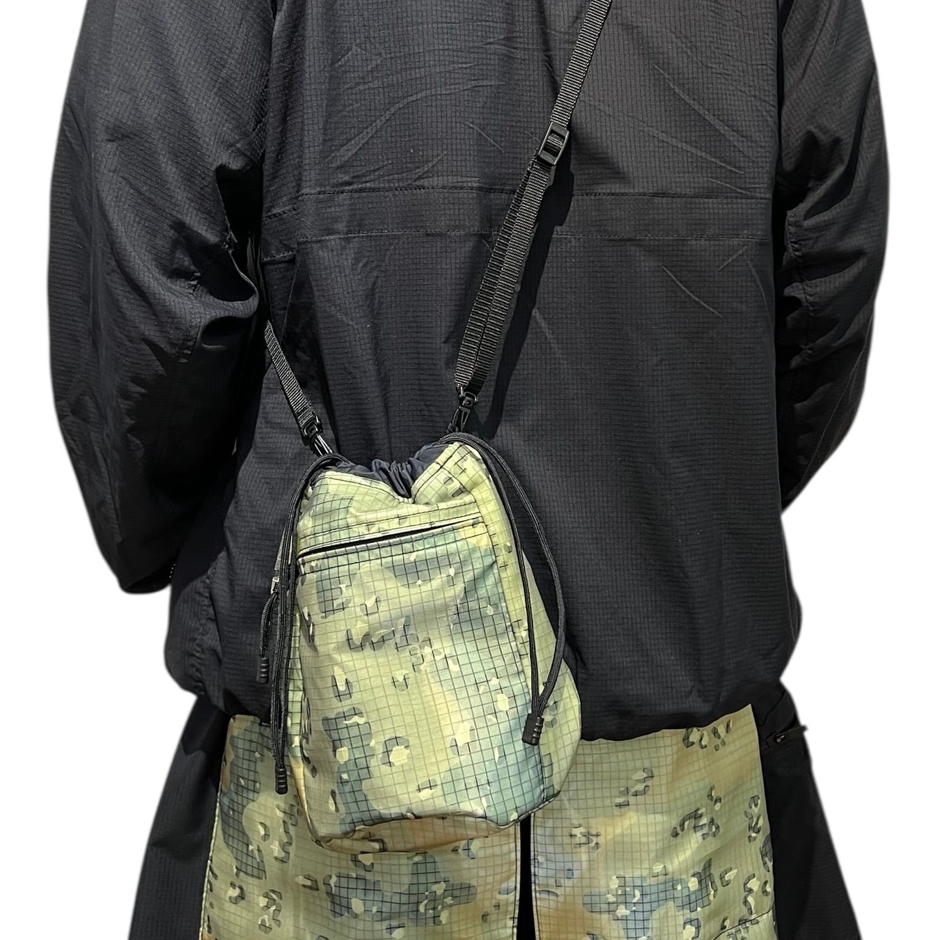 蓄光リフレクター生地とWiniche&Co.オリジナル迷彩柄メッシュナイロンを組み合わせた巾着ポーチ。