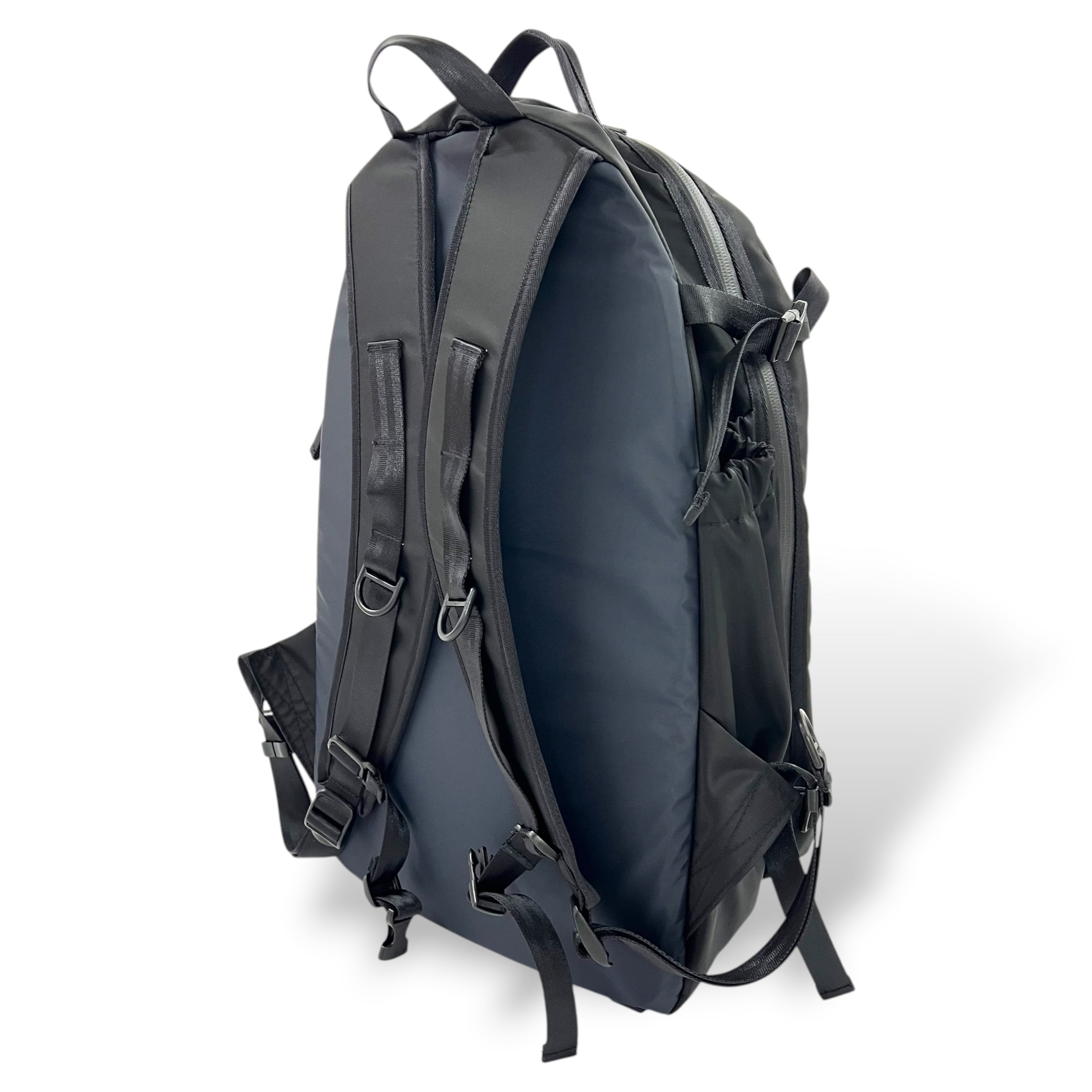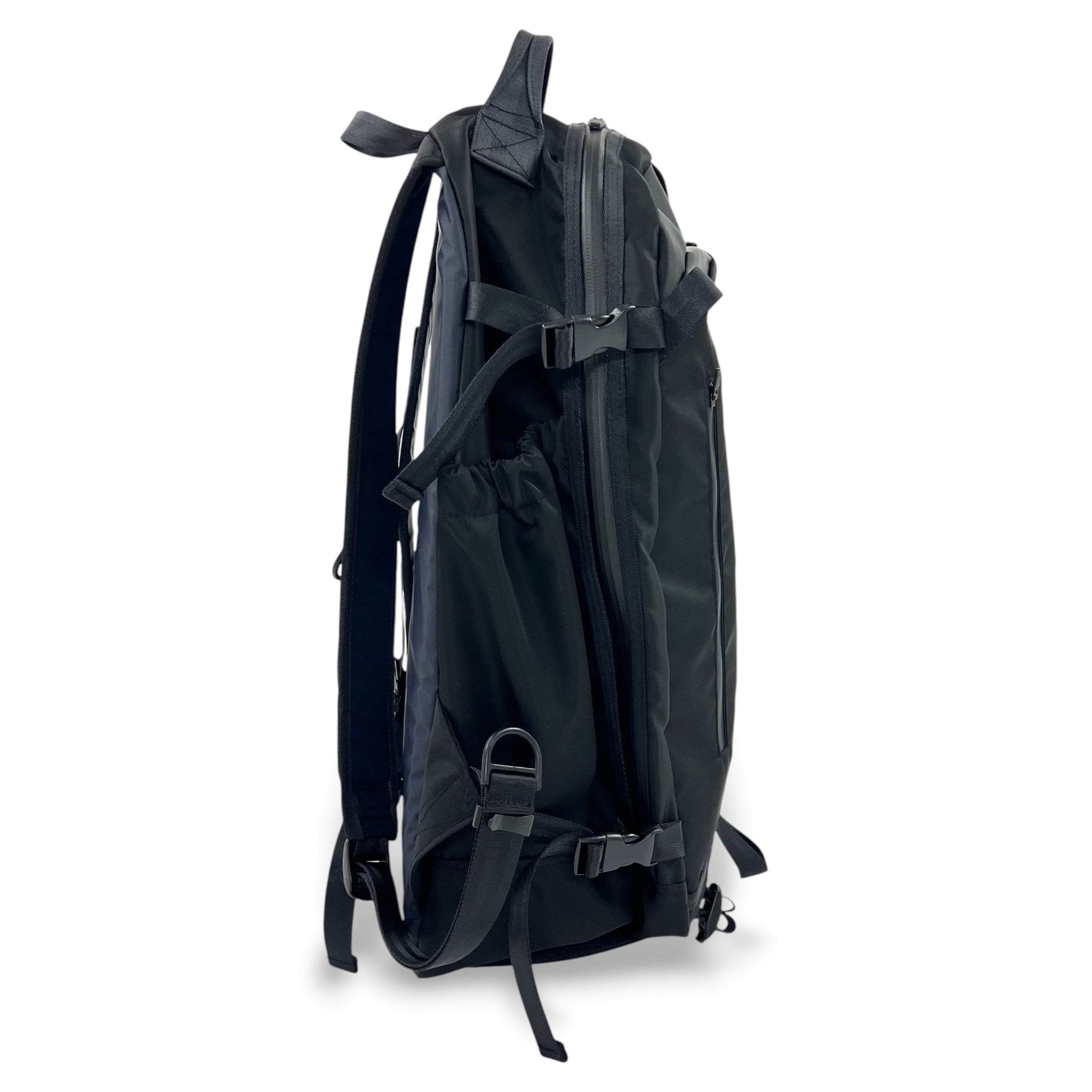 メインコンパートメント、サブコンパートメントの他に、折り畳み傘やペットボトル収納用のサイドポケット、PCやタブレット収納用の内ポケットなどを各所に配置。